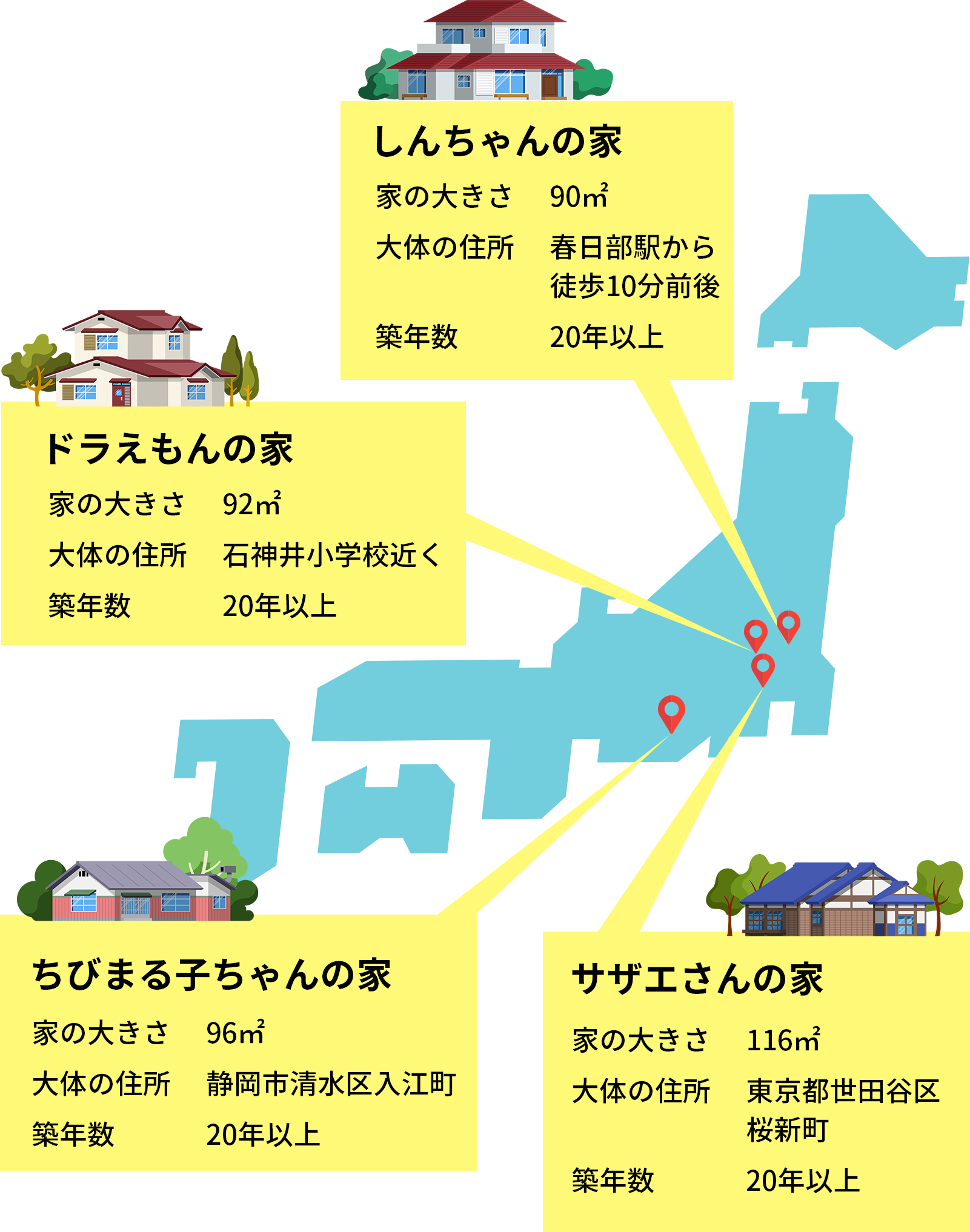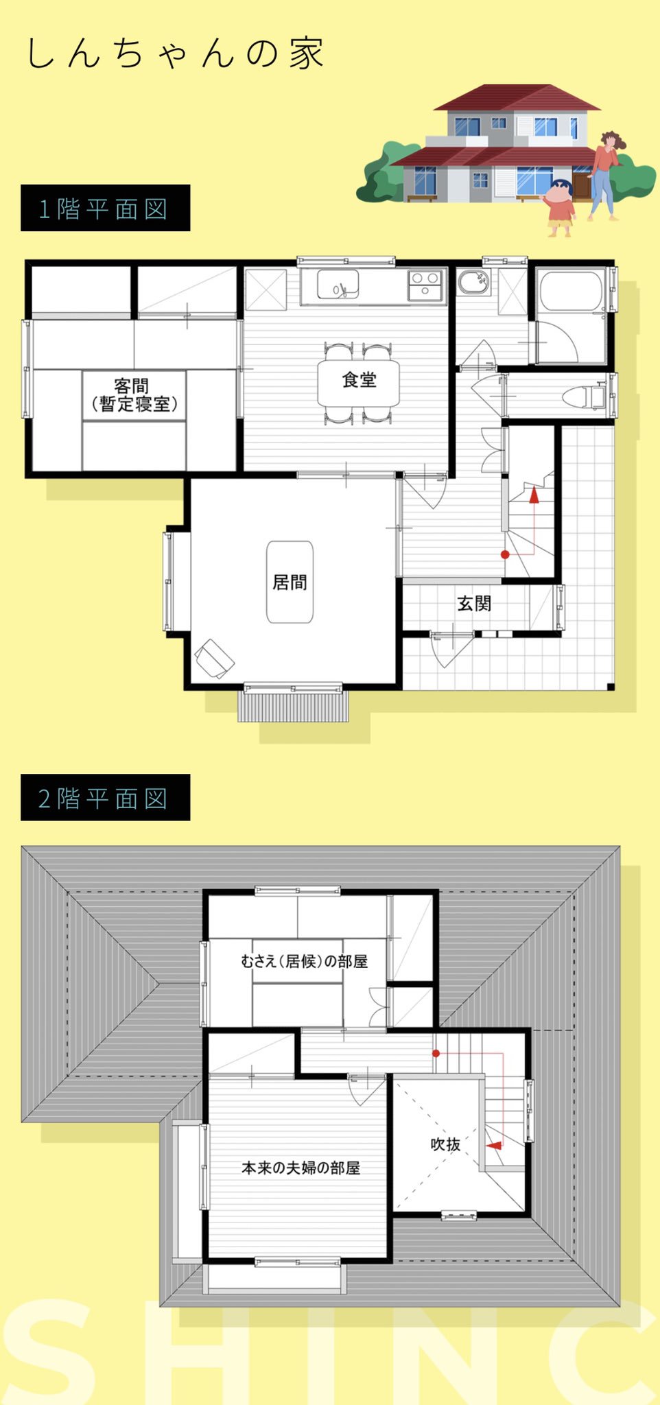 在动画中并没有直接提到房屋的价格和贷款金额,2019 年,有为名叫 ニシキドアヤト 的网友,在推上发了一个帖子(可惜原帖链接中的完整博文已不可访问,不过好在网络上能很容易的找到当年相关的截图),探讨了像《哆啦A梦》、《蜡笔小新》、《樱桃小丸子》和《海螺小姐》这些动画中,房屋的位置、平面图和大致价格