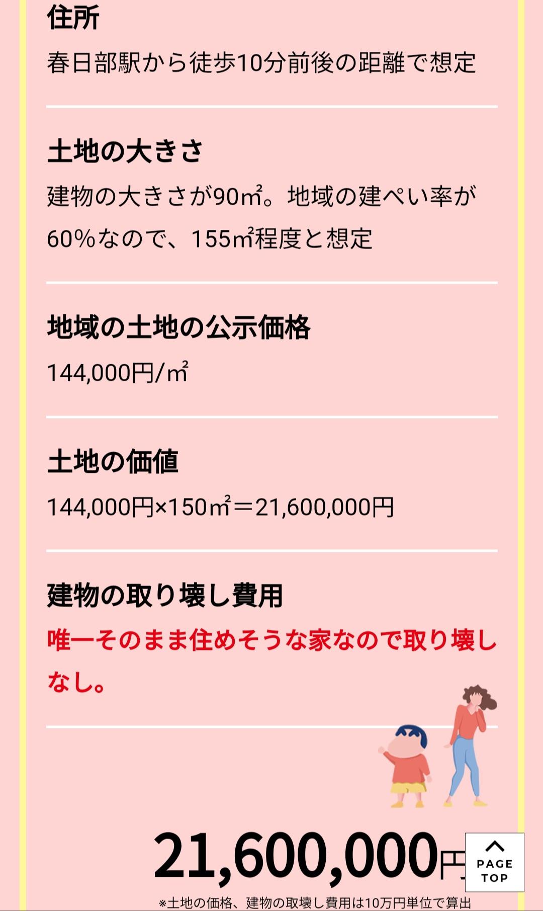 可以看到小新的家位于埼玉县春日部市,步行到春日部站在 10 分钟左右的时间,家的建筑面积为 90 平米,按照该地区建筑区域占土地面积比例为 60% 推算,其占地面积约为 150 平米,而按照 2019 年的价格估算为 2160 万日元。