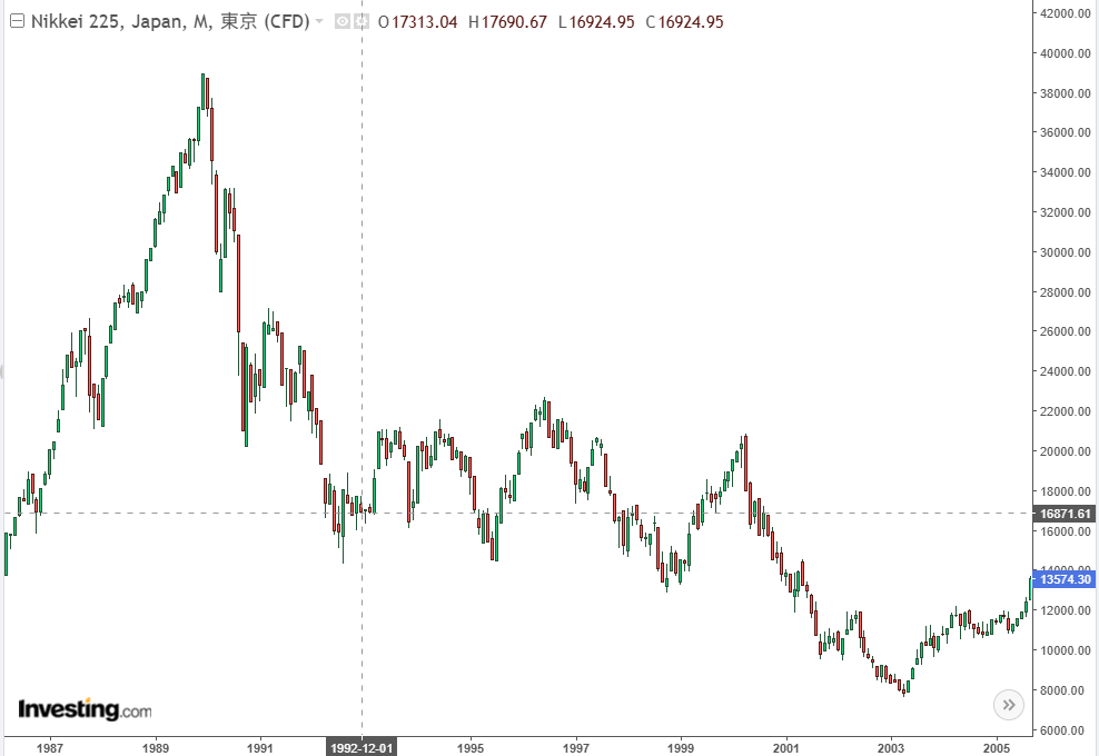 在 1992 年底,日经 225 收报于 16924.95 点,较 1989 年 12 月 29 日的 38957.44 高点下跌了 57%;但这并不是短暂的股市暴跌,而是随后持续了二十多年的漫漫熊途;直到 2012 年底,日本股市才重新恢复上涨趋势,而回到 1989 年的顶点则还需要等到 2024 年。