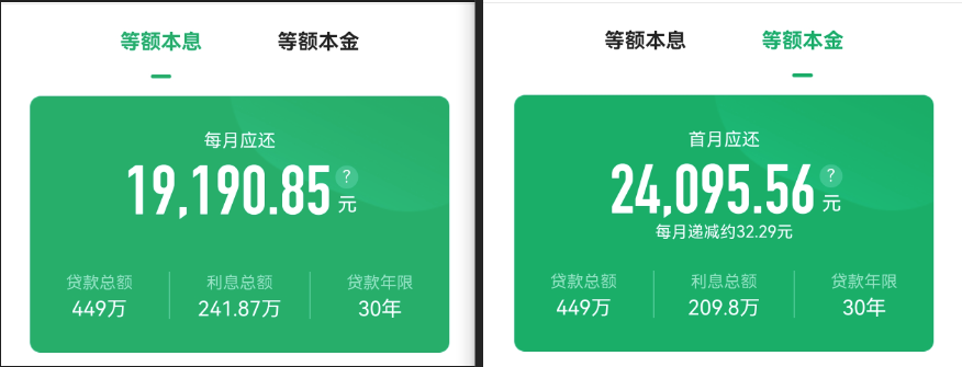 虽然 23 年贷款利率较高,不过 2024 年,我国推出政策,将当时符合相应条件的存量住房贷款利率将统一批量调整为不低于贷款市场报价利率(LPR)减30个基点;23 年上海高点买入此房屋,首付 30%,那么贷款总额为 449 万,又由于我国的公积金政策,一般家庭可以选择组合贷款,即公积金贷款 120 万,剩余为商贷,所以按此计算等额本金和等额本息分别为